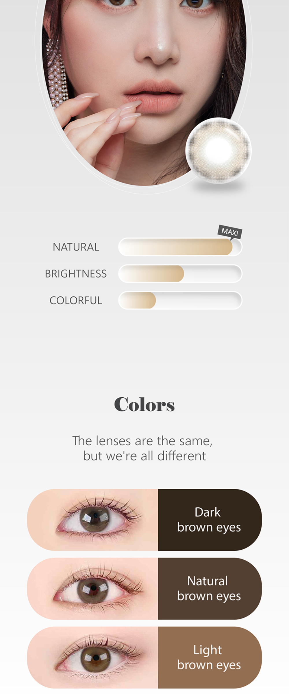 – 은은한 서구 감성이 감도는 내추럴 브라운 톤으로, 본래 눈동자 색과 자연스럽게 어우러집니다.